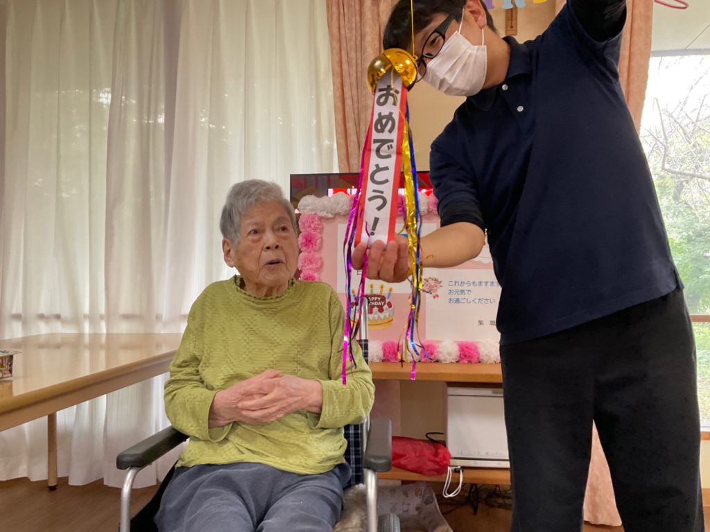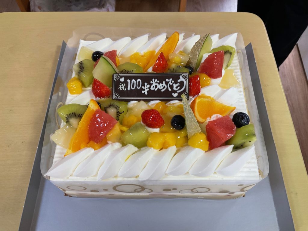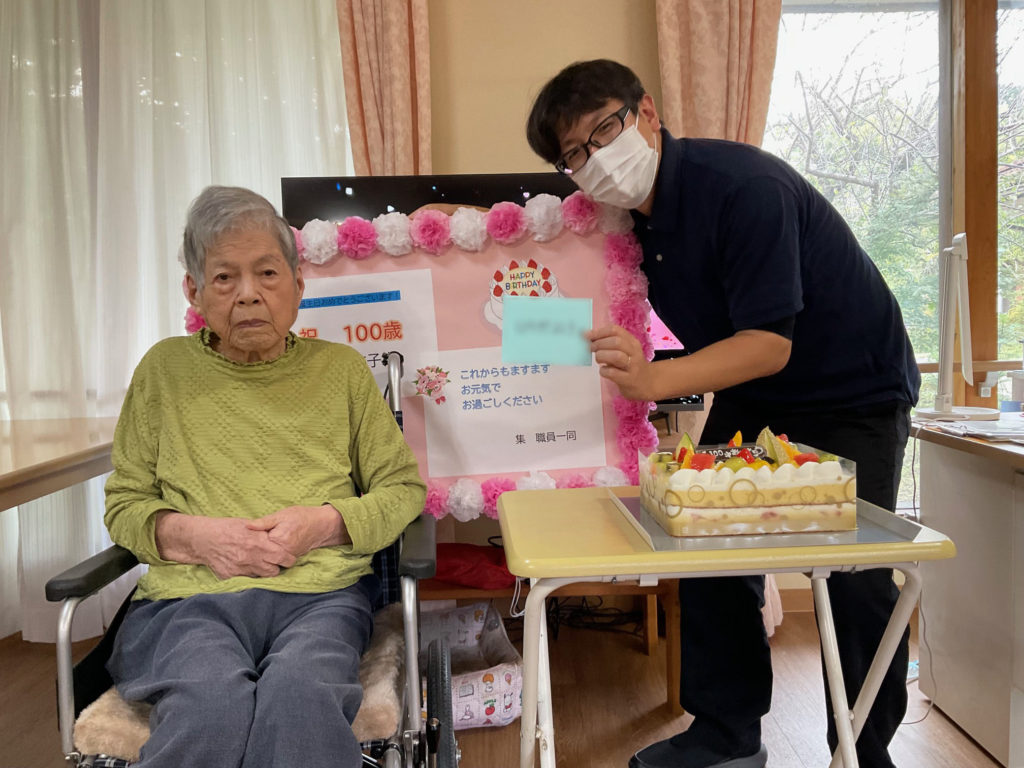 100歳の誕生日おめでとうございます。バースデーケーキと職員からの盛大な『おめでとう!』の祝福に、満面の笑顔で喜ばれるお誕生日となりました。